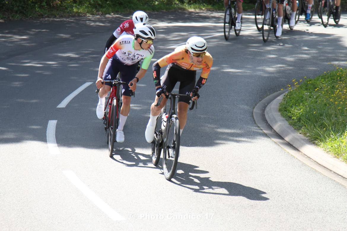 Dans le peloton, l’équipe s’est parfaitement organisée en « second rideau ». Idéalement placés, nos coureurs ont su saisir l’opportunité au moment où le bon coup s’est formé à l’entrée du circuit final, projetant Dorian (C.O.Couronnais) et Mickaël (U.A.La Rochefoucauld) à l’avant.