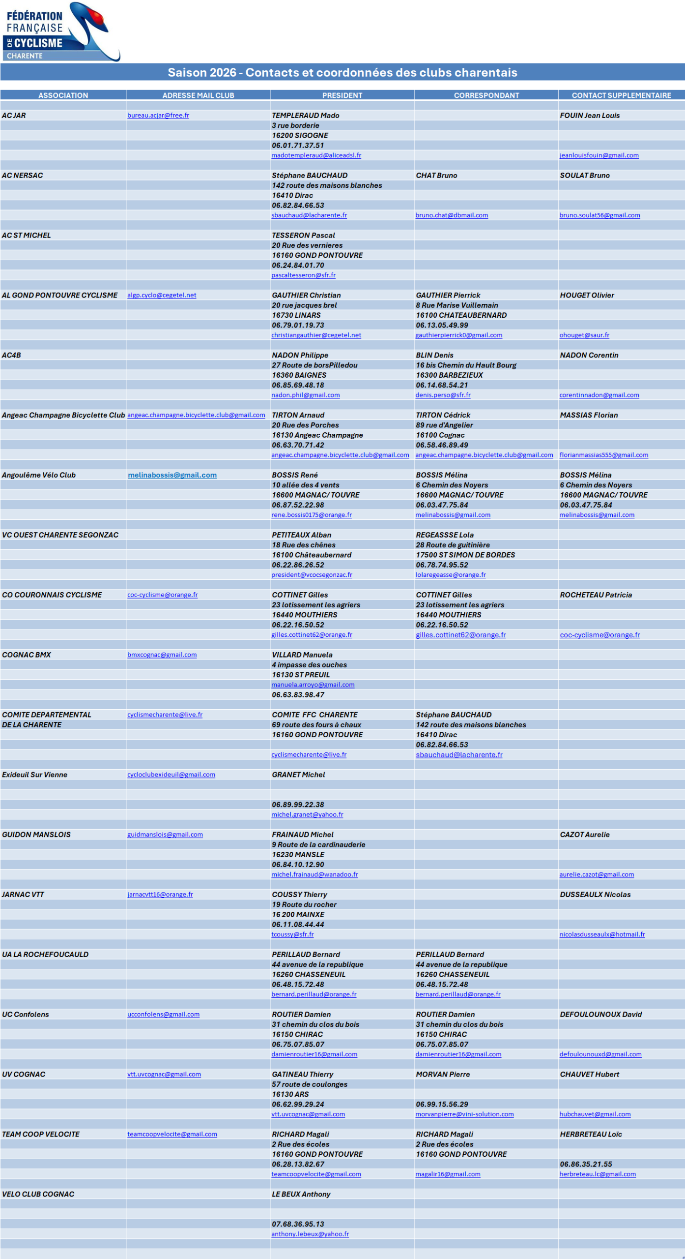 2026 – Coordonnées des Clubs Charentais 01.04.2026